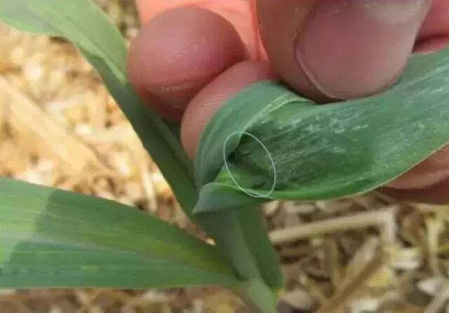 玉米蓟马体型小,且活动为害部位隐蔽,不易被发现,它以成虫或若虫在玉米心叶内刺吸嫩叶汁液,破坏玉米生长点,往往使玉米叶片发黄失绿,重者使玉米心叶卷曲成“牛尾巴”状畸形生长,节间缩短,就是种植户常说的“玉米拧芯”,严重影响玉米的正常生长。干旱对其大发生有利,降雨对其发生和危害有直接的抑制作用。目前气温偏高,降水偏少,极有利于蓟马的发生危害。